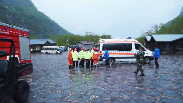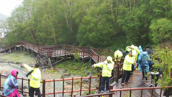 9點(diǎn)05分,演練第一個場景開始,模擬瀑布持續(xù)降雨,發(fā)生泥石流等地質(zhì)災(zāi)害,威脅游客生命安全。應(yīng)急預(yù)案啟動后,景區(qū)山門發(fā)布瀑布、溫泉景點(diǎn)關(guān)閉告知,景區(qū)30名應(yīng)急救援隊人員趕赴瀑布、溫泉景點(diǎn),展開拉網(wǎng)式疏散。與此同時,治安支隊出動3臺警車、20名警員趕赴瀑布景點(diǎn),協(xié)助公司交通疏導(dǎo)和秩序維護(hù),在大停車場入口設(shè)置警戒線和柵欄,封閉景點(diǎn);運(yùn)營二部5臺中巴,15臺大巴車分批次奔赴瀑布停車場,將游客運(yùn)送到安全地帶。