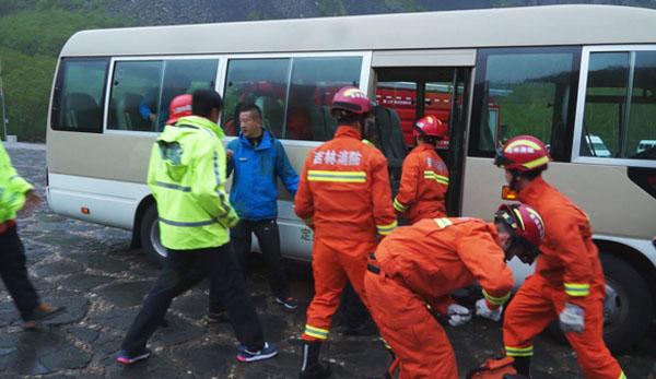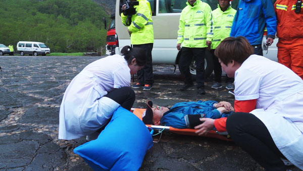 第二個場景,模擬山體崩塌,滾石砸中一輛運(yùn)載20名乘客的中巴車車門,造成車門損壞無法開啟,1名游客因受到驚嚇心臟病發(fā)作。應(yīng)急預(yù)案啟動后,駕駛員立即使用對講機(jī)向上級報告,瀑布工作人員立即趕到車輛附近,協(xié)助駕駛員打開駕駛室車門,車內(nèi)游客迅速下車離開危險地帶。隨后,長白山消防支隊、景區(qū)醫(yī)護(hù)人員先后趕到現(xiàn)場,消防員們使用工具破門解救,醫(yī)護(hù)人員現(xiàn)場急救心臟病游客,隨后被長白山中心醫(yī)院120急救車送往醫(yī)院。與此同時,調(diào)度應(yīng)急救援隊將車輛推離危險區(qū)域;檢修車輛牽引事故車輛離開危險區(qū)域。