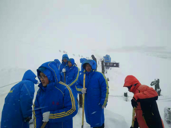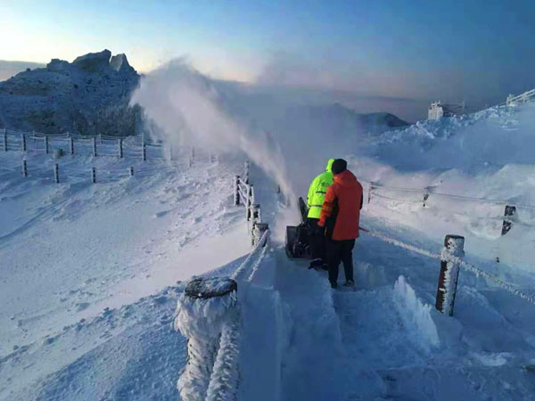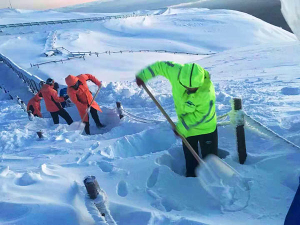 大雪連下兩天,封住了主峰的路,為盡快的讓游客們領(lǐng)略天池美景,公司投入了大量的人力、物力進行了一場“安全防滑、速保暢通”的清雪攻堅戰(zhàn)。
