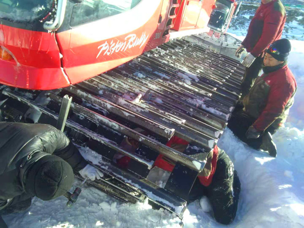 11月16日清晨,雪地車在長白山北主峰公路黑風口清雪作業(yè)時,出現(xiàn)前拐軸折斷故障,無法繼續(xù)正常作業(yè)。北景區(qū)檢修部接到報告后,迅速抽調(diào)經(jīng)驗豐富的檢修技工攜帶搶修工具和配件前往現(xiàn)場展開維修。
